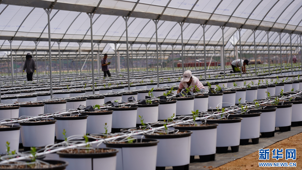 工人正在移栽蓝莓苗(4月18日摄)。新华网发(宾川县融媒体中心供图)