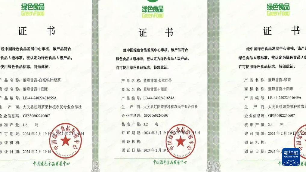 2024年2月,该合作社的十个茶产品通过中国绿色食品发展中心认证,一次性取得十张“绿色食品证书”。