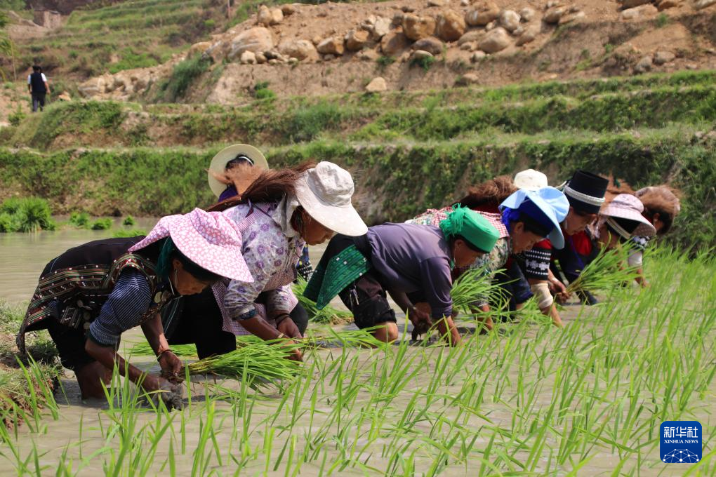 歌声在梯田间飘荡,村民们怀着欢快的心情拔秧、插秧……一排排葱绿的秧苗整齐地排列于田间,微风吹过,秧苗轻轻摇摆,荡漾起无限生机。