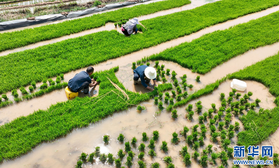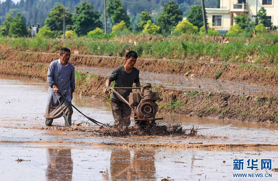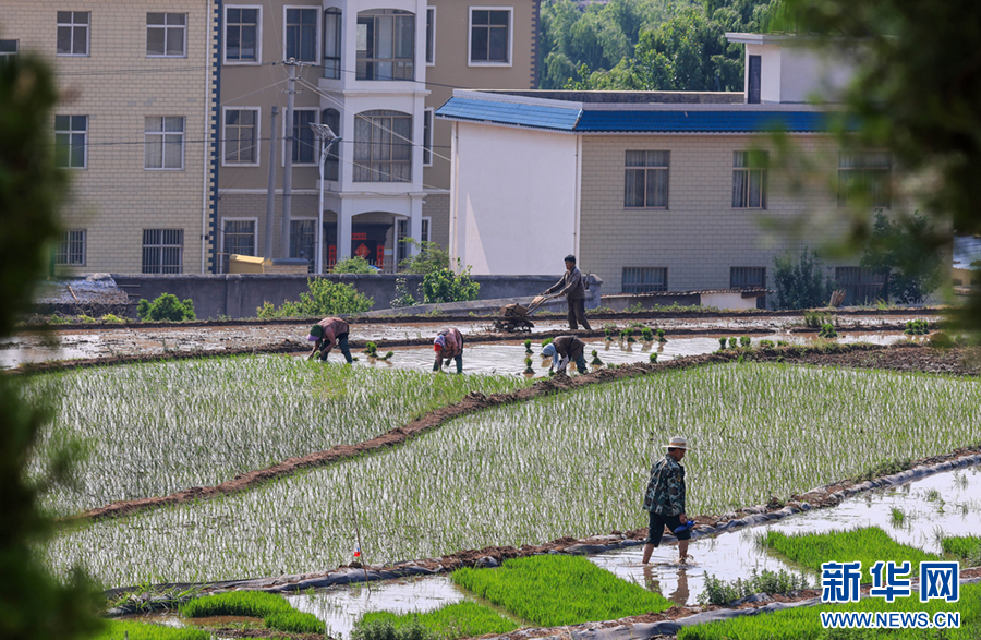 春末,在云南省曲靖市沾益区天生坝村,村民们抢抓农时,翻犁田地、拔秧、插秧,田间地头一派忙碌景象,劳作的村民与翠绿的秧苗共同勾勒出一幅田园劳作图。新华网发(孙文来 摄)