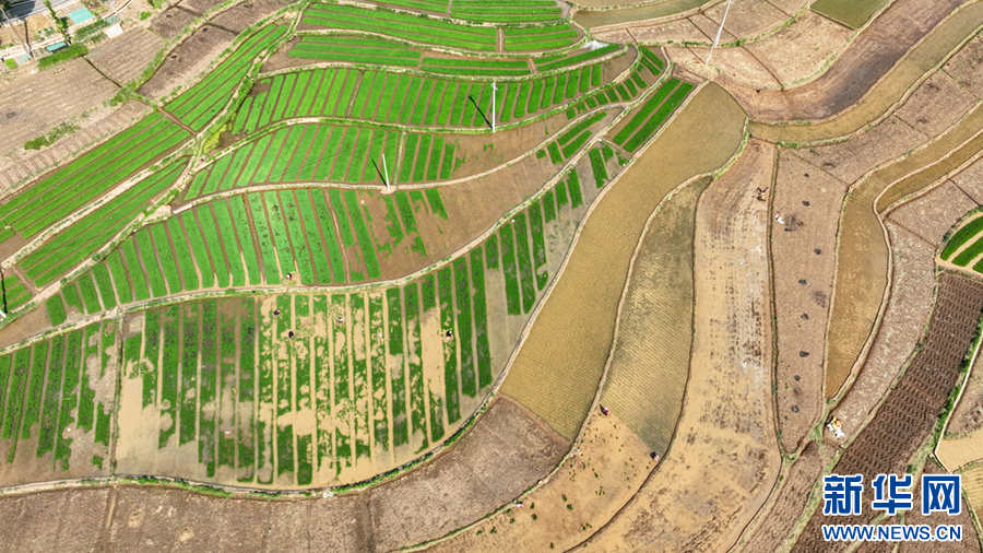 云南省曲靖市沾益区天生坝村,劳作的村民与翠绿的秧苗共同勾勒出一幅田园劳作图(4月28日摄)。新华网发(孙文来 摄)