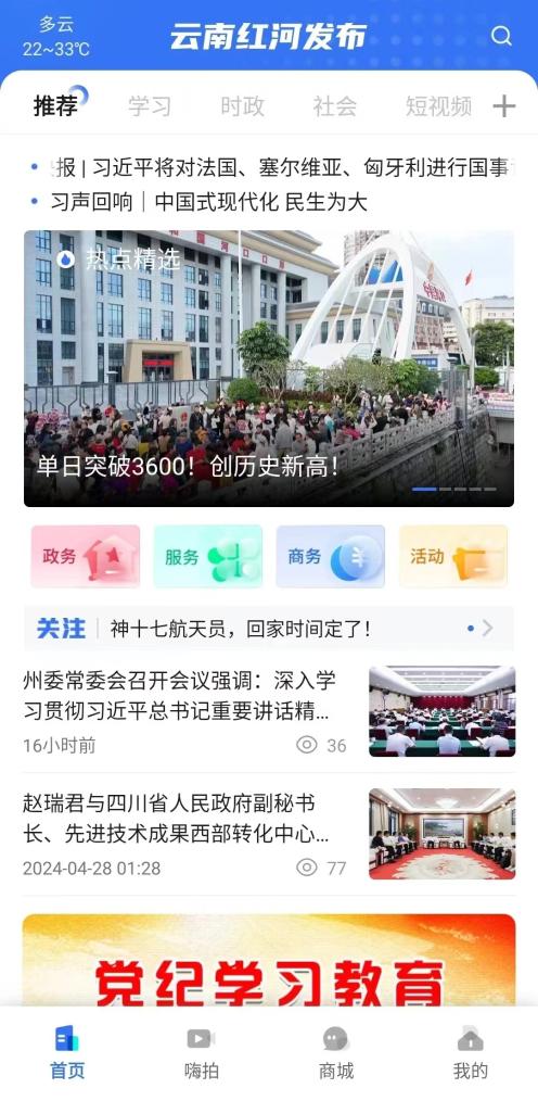 创新推出社交与网购功能,融合新闻、政务、服务和商务四大板块的融媒平台——“云南红河发布”客户端30日正式改版上线。