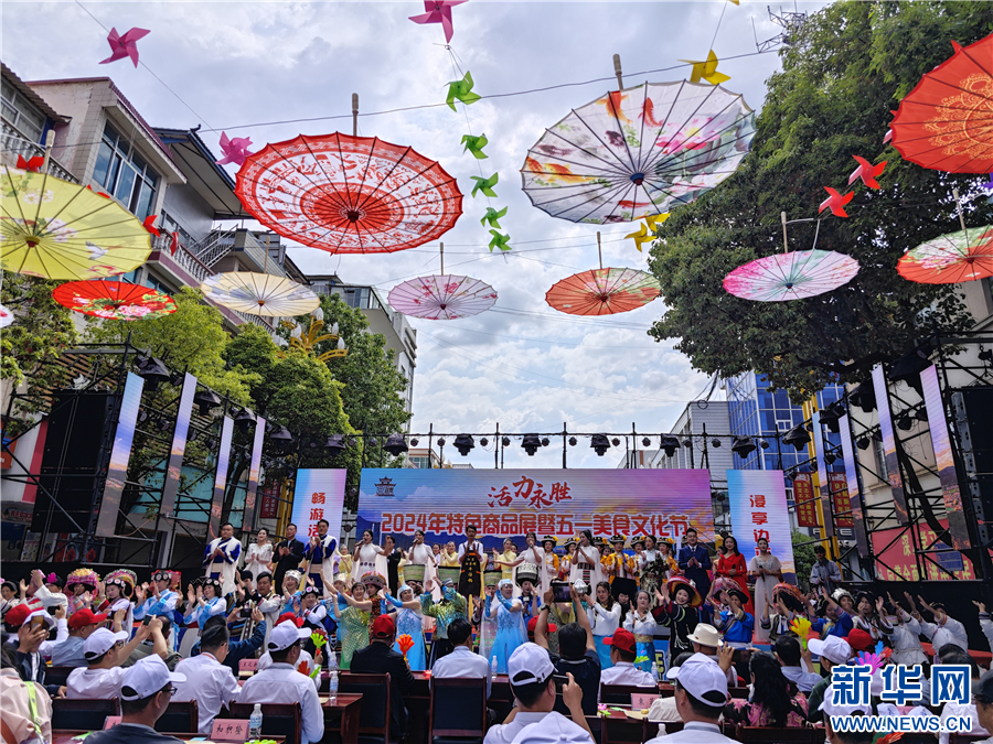 “活力永胜”2024年特色商品展暨五一美食文化节开幕式现场(5月1日摄)。新华网发(永胜县融媒体中心供图)