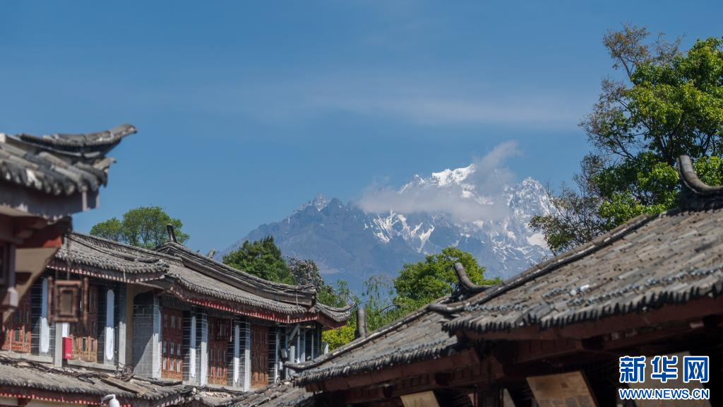 丽江古城的飞檐翘角和玉龙雪山相互掩映(资料图)。新华社记者 胡超 摄