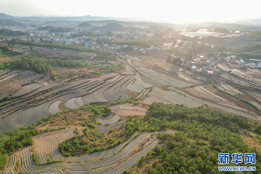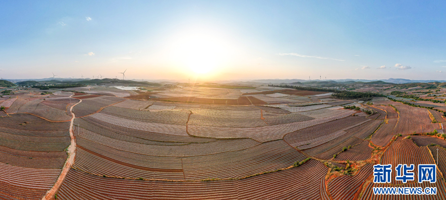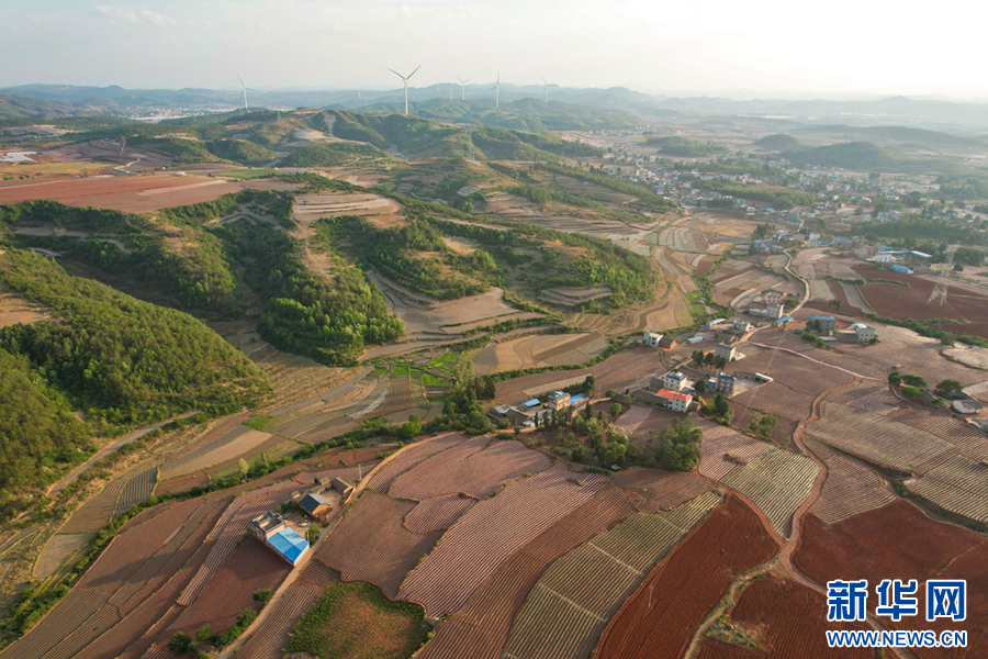 近日,位于滇东高原的云南省曲靖市沾益区的农田里,红土地上开出成行的垄,阡陌纵横,如同写在大地上的道道诗行。空中鸟瞰,红土地与村庄、山峦、风车、夕阳等相应成景,构成了一幅美丽的田园画卷。新华网发(杨俊鹏 摄)