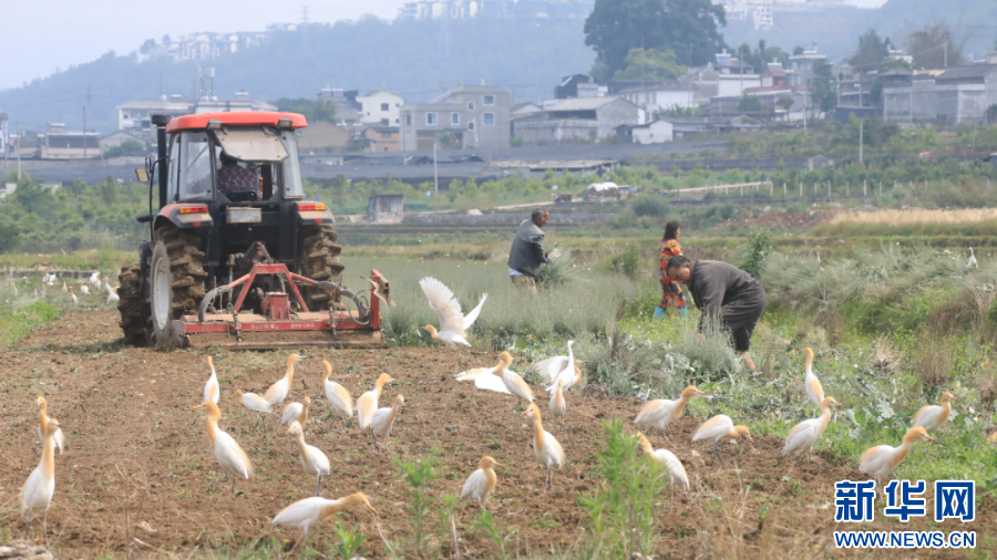 和顺镇农民忙农耕,白鹭在田间飞舞(5月8日摄)。新华网发(龚祖金 摄)