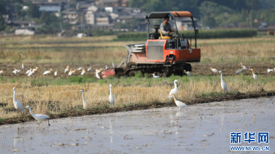 黄坡社区农民忙农耕,白鹭在田里觅食(5月10日摄)。新华网发(龚祖金 摄)