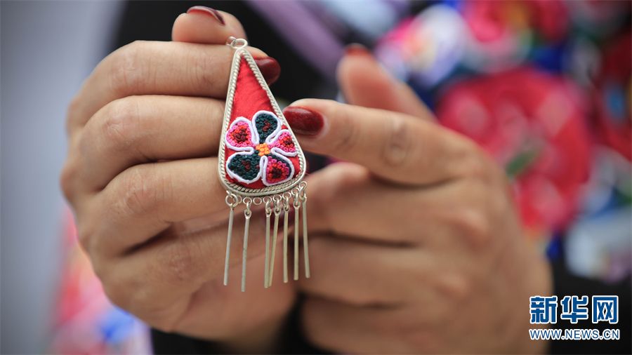 做工精细的彝绣耳饰(2023年6月9日摄)。新华网发(徐华陵 摄)
