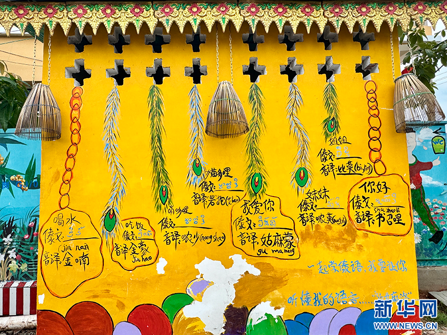 尚冈村内具有傣族特色的打卡墙(5月16日摄)。新华网发(李娜 摄)
