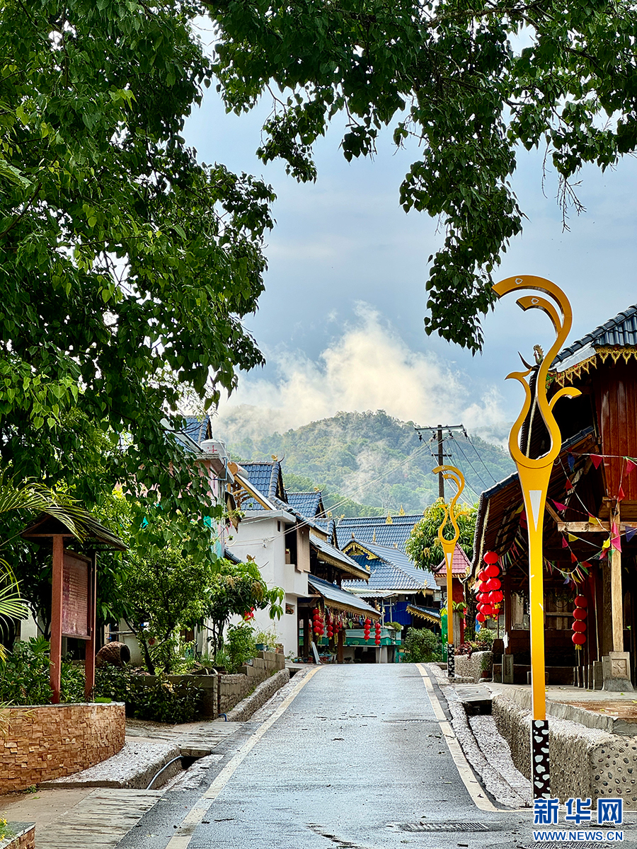 干净崭新的柏油路、设有近百个停车位的泼水广场、深蓝琉璃瓦片搭配傣家吊脚楼、枝繁叶茂的百年古菩提树……雨过天晴,远山的薄雾渐渐散开,通过精致美观的寨门后便进入磨憨镇尚冈村,眼前的美丽村貌惊艳着每一位来访者。