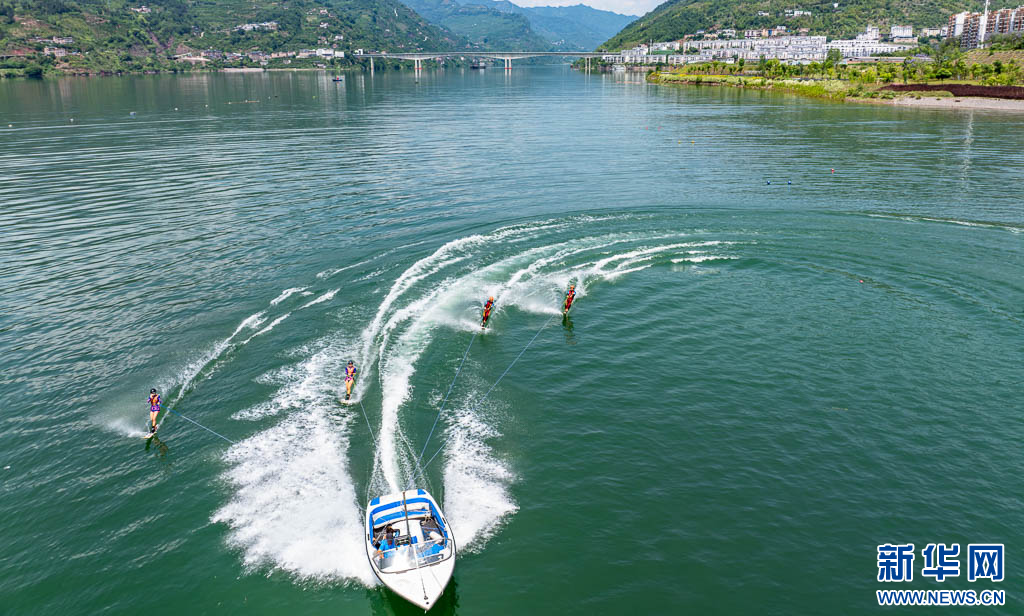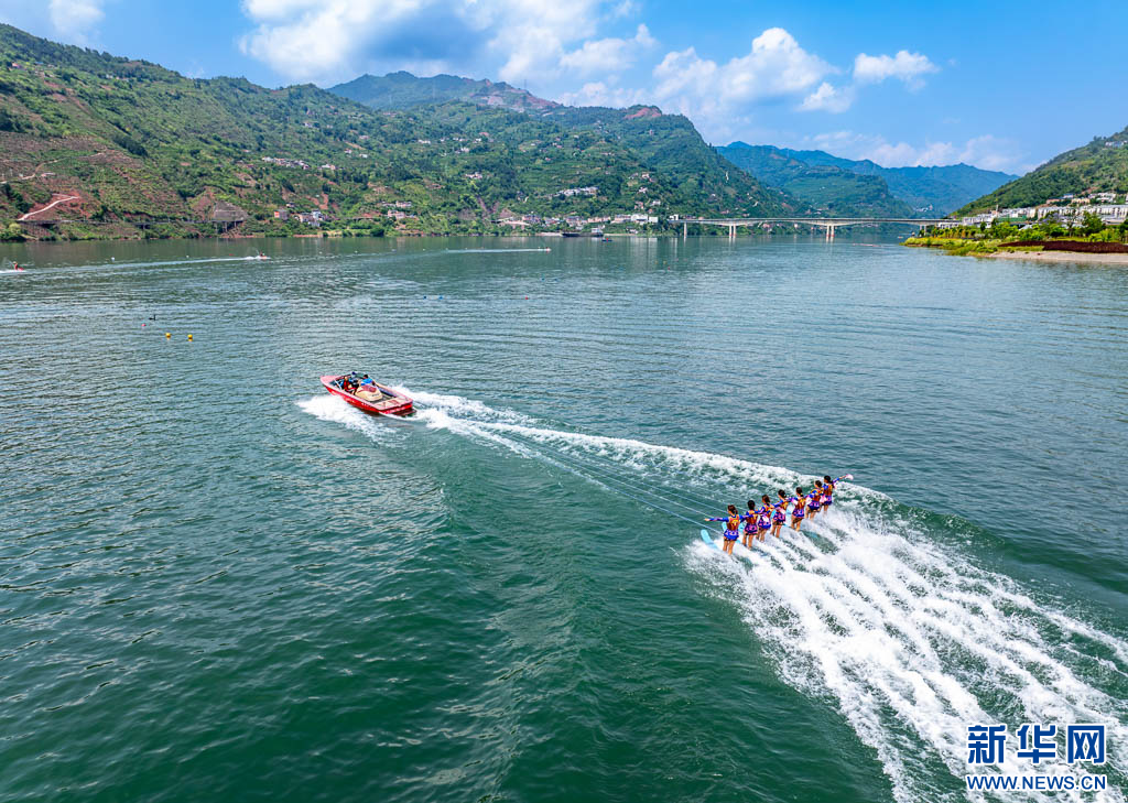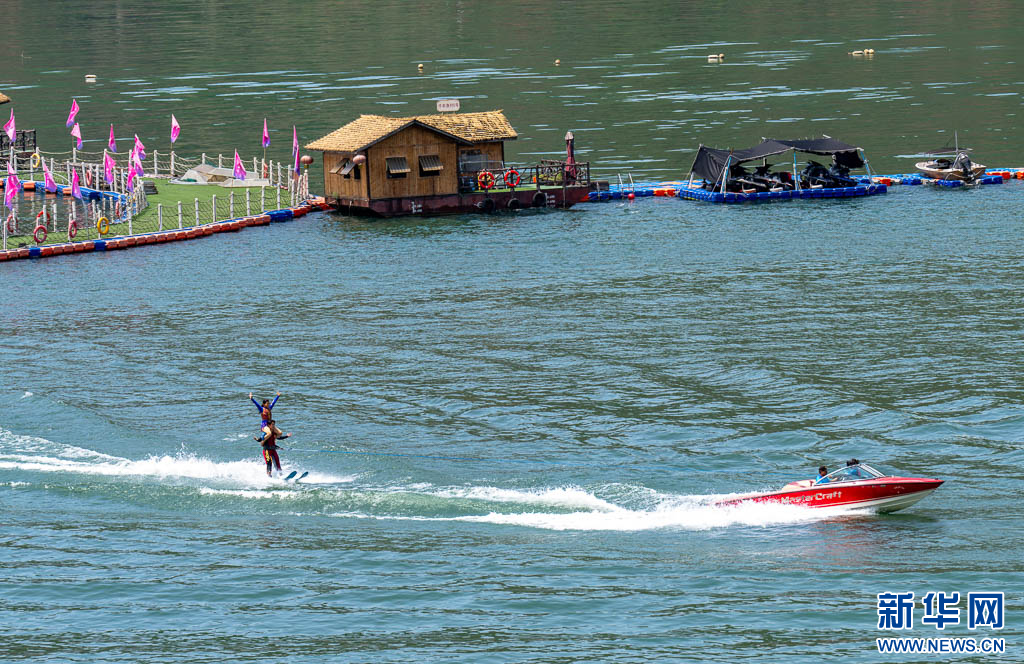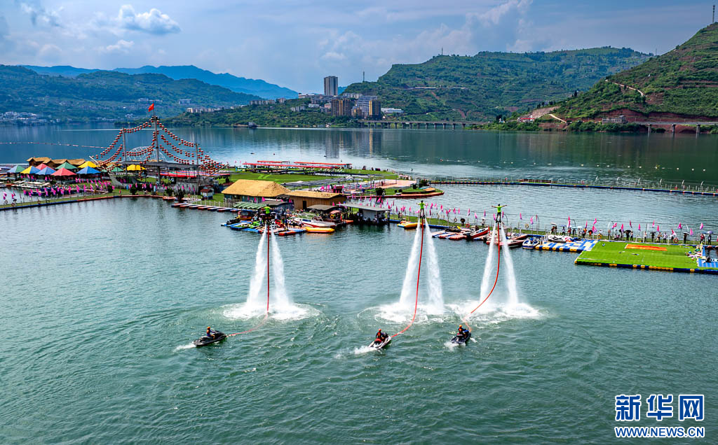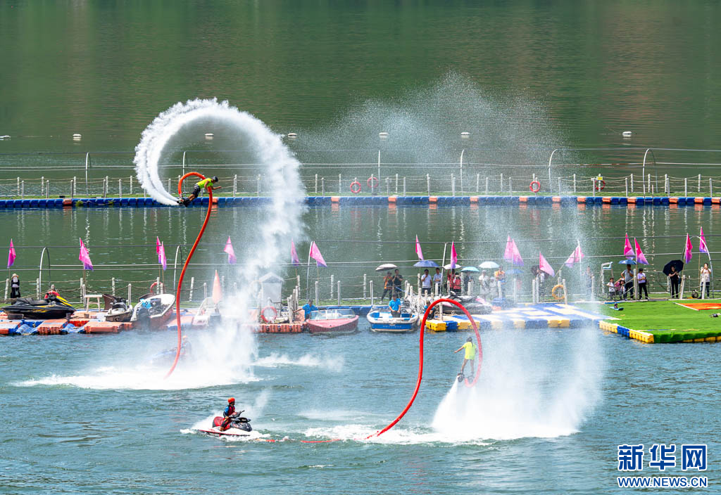 近日,云南省昭通市绥江县金沙水上乐园景区举行“水上飞人”表演,在给观众带来一场视觉盛宴的同时,乐享清凉夏日。(曾三东)