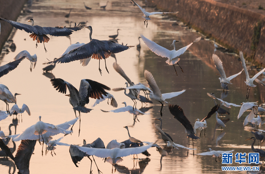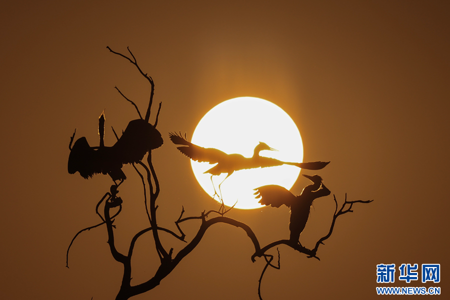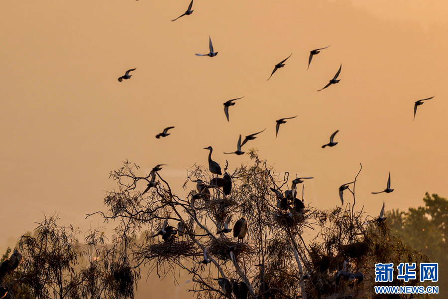 晨曦中,成群的鹭鸟翩翩飞舞(5月22日摄)。新华网发(孙文来 摄)