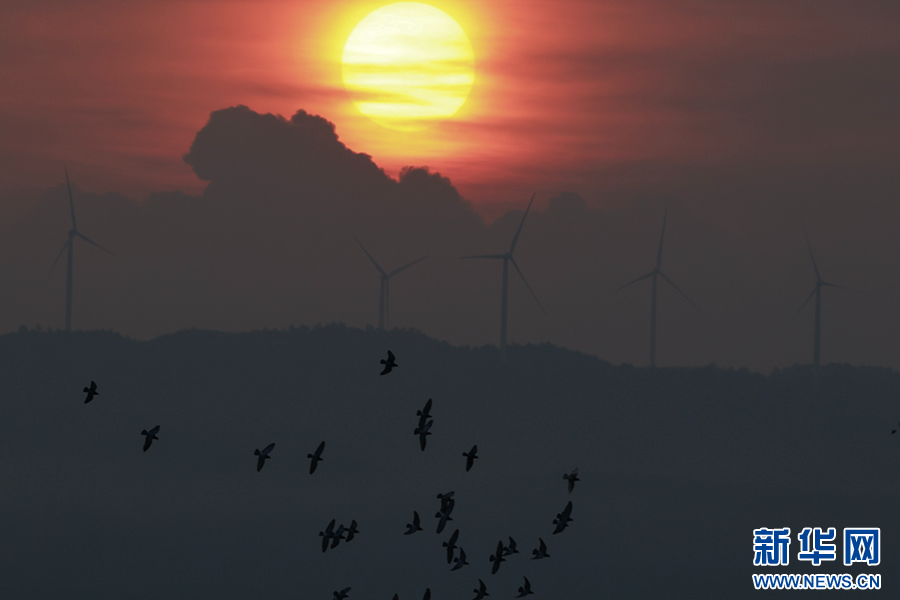 朝阳下,群鸟飞过(5月22日摄)。新华网发(孙文来 摄)