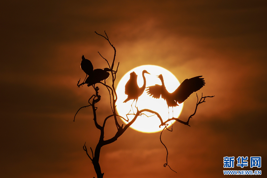 朝阳下,鹭鸟立枝头(5月22日摄)。新华网发(孙文来 摄)