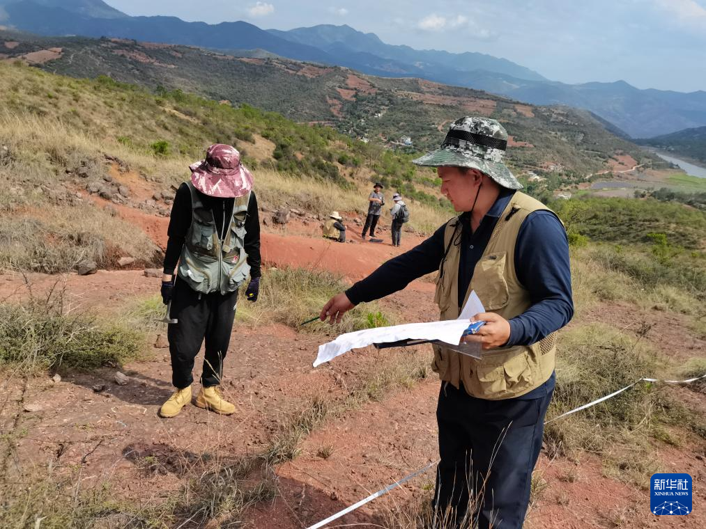 工作人员在现场测量恐龙足迹化石。(禄丰市融媒体中心供图)