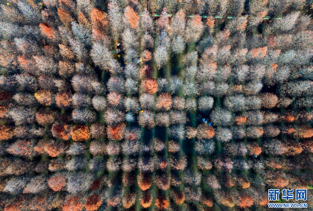 2023年1月5日,游客在昆明市海洪湿地公园里划船(无人机照片)。新华社记者 陈欣波 摄