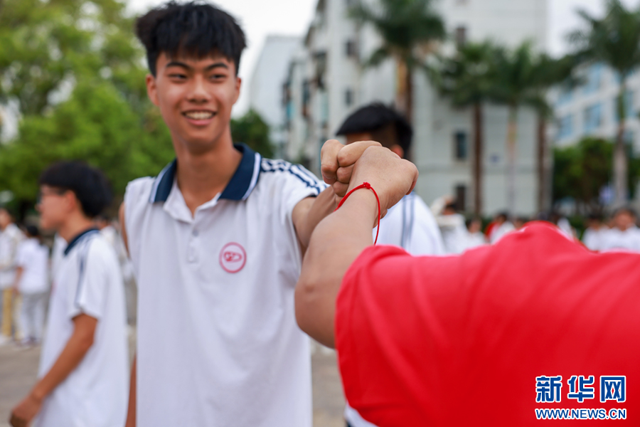 在云南省开远市考点,送考老师与一名考生互相碰拳加油(6月7日摄)。新华网发(陶家淇 摄)