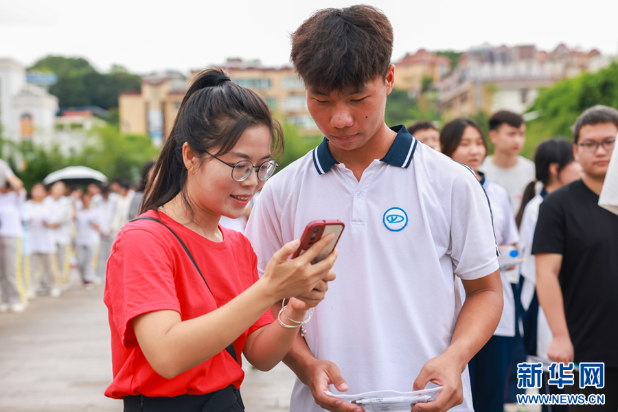 6月7日,2024年全国高考拉开帷幕。在云南省红河哈尼族彝族自治州开远市考点,考生们满怀信心步入考场,送考老师们换上了寓意“开门红”的红色T恤,精心做好考试组织服务工作,保障高考顺利进行。新华网发(陶家淇 摄)