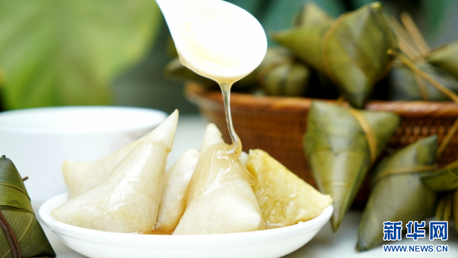施甸粽子蘸麦芽糖汁很美味(6月4日摄)。新华网发(施甸县融媒体中心供图)