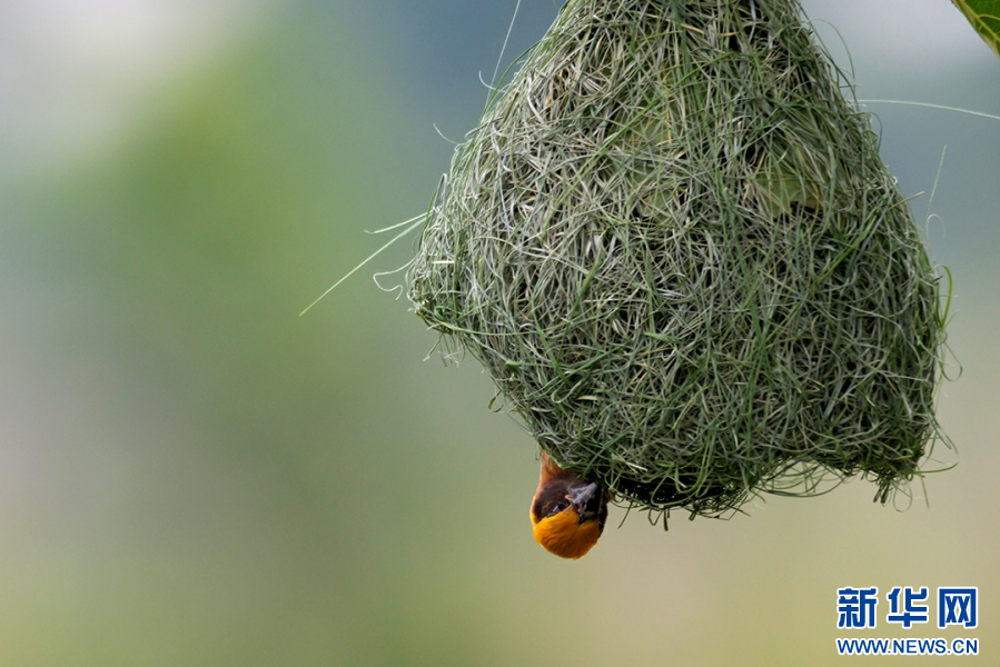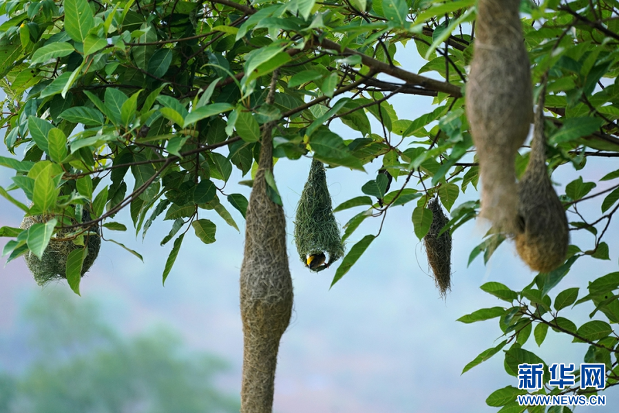 黄胸织布鸟正在筑巢(6月6日摄)。新华网发(昌宁县融媒体中心供图)