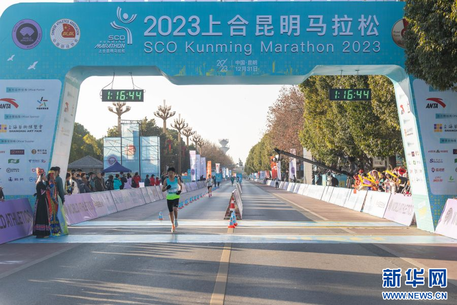 参加上合昆明马拉松比赛的选手在比赛中(2023年12月31日摄)。新华网发(李浩 摄)