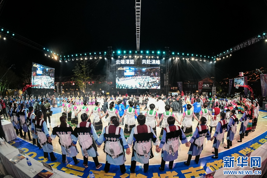 2023-2024云南省城市篮球联赛总决赛现场的民族打跳表演(3月21日摄)。新华网发(云南省城市篮球联赛组委会 供图)