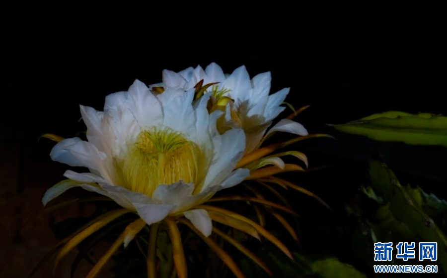 近日,云南省德宏傣族景颇族自治州瑞丽市的摄影爱好者,用延时摄影记录下火龙果花盛开的瞬间。与火龙果果实热烈的颜色不同,火龙果花的花瓣洁白剔透,花蕊淡黄,在月光下显得娴静淡雅。