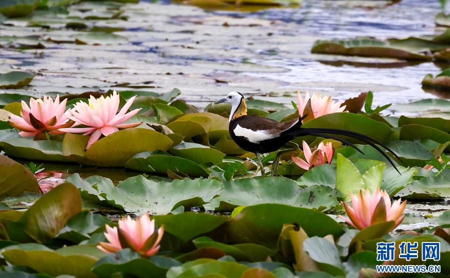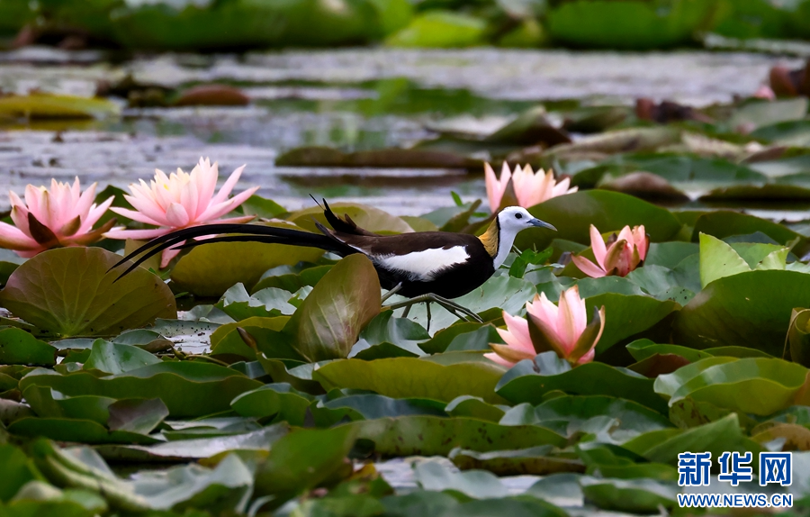 大理洱源,一只水雉在莲叶间“漫步”(摄于6月15日)。新华网发(罗新才 摄)