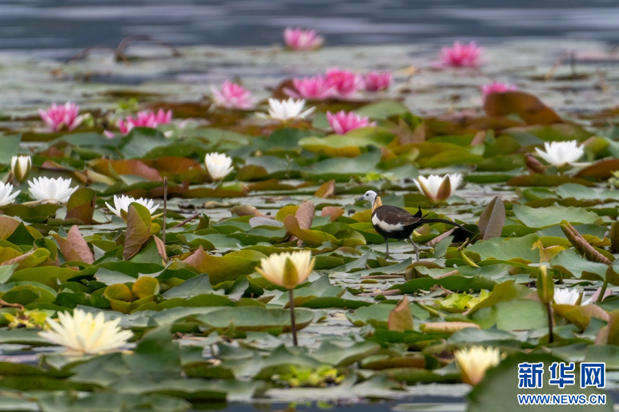 大理洱源,一只水雉在莲叶间“漫步”(摄于6月11日)。新华网发(赵泽恒 摄)