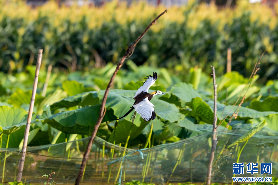 大理洱源,一只水雉翱翔于水面之上(摄于6月11日)。新华网发(赵泽恒 摄)