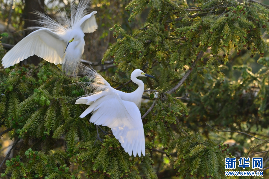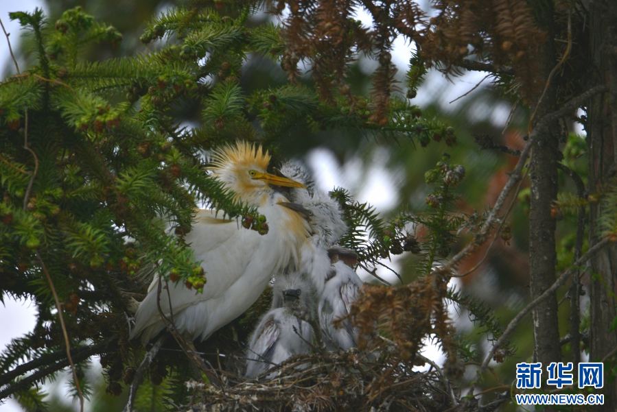 白鹭衔树枝筑巢(6月11日摄)。新华网发(昌宁县融媒体中心供图)