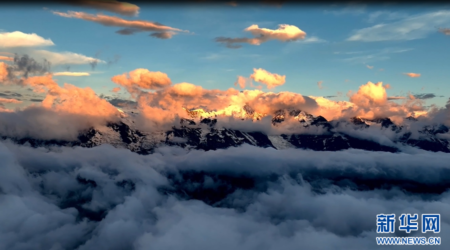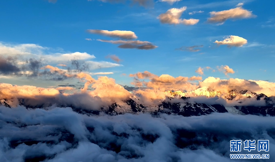 近日,摄影师在云南省迪庆藏族自治州德钦县飞来寺附近,用无人机拍摄记录下云层之上的梅里雪山“日照金山”的珍贵画面。画面中,清晨的日光染金了云层,白茫茫的雪山与蓝色的天空相得益彰,美景令人震撼。(完)(德钦县融媒体中心 李春雷)