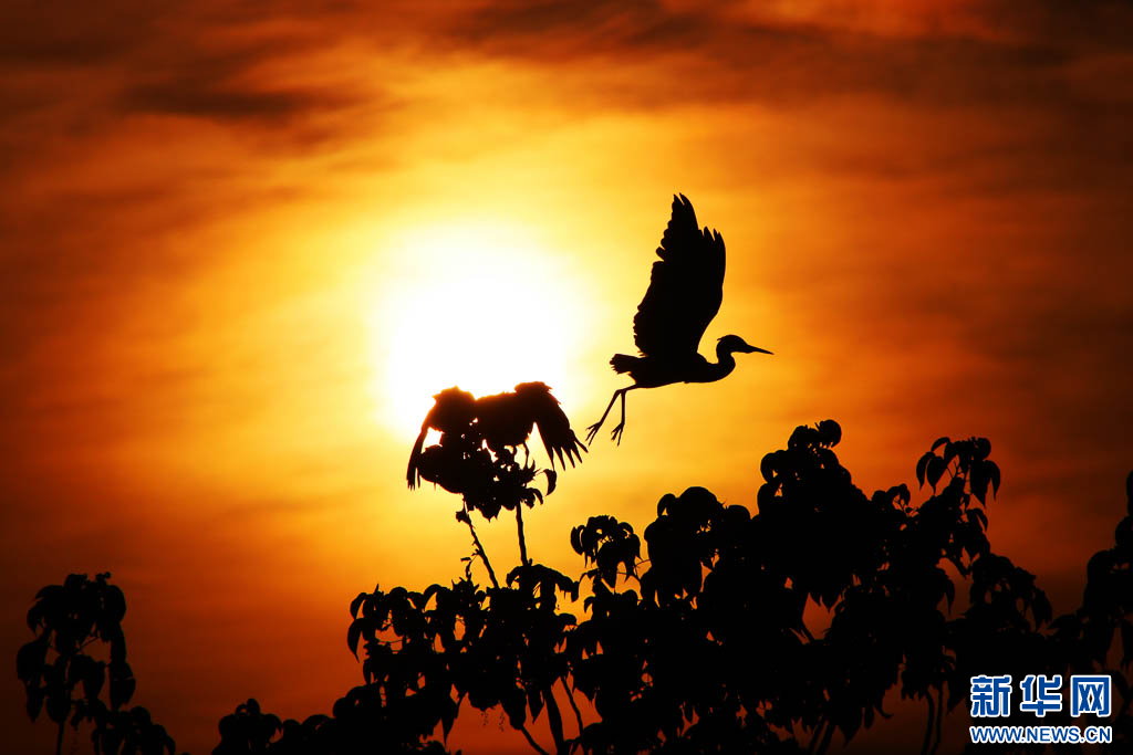 朝阳下,苍鹭振翅高飞(6月11日摄)。新华网发(赵树龙 摄)