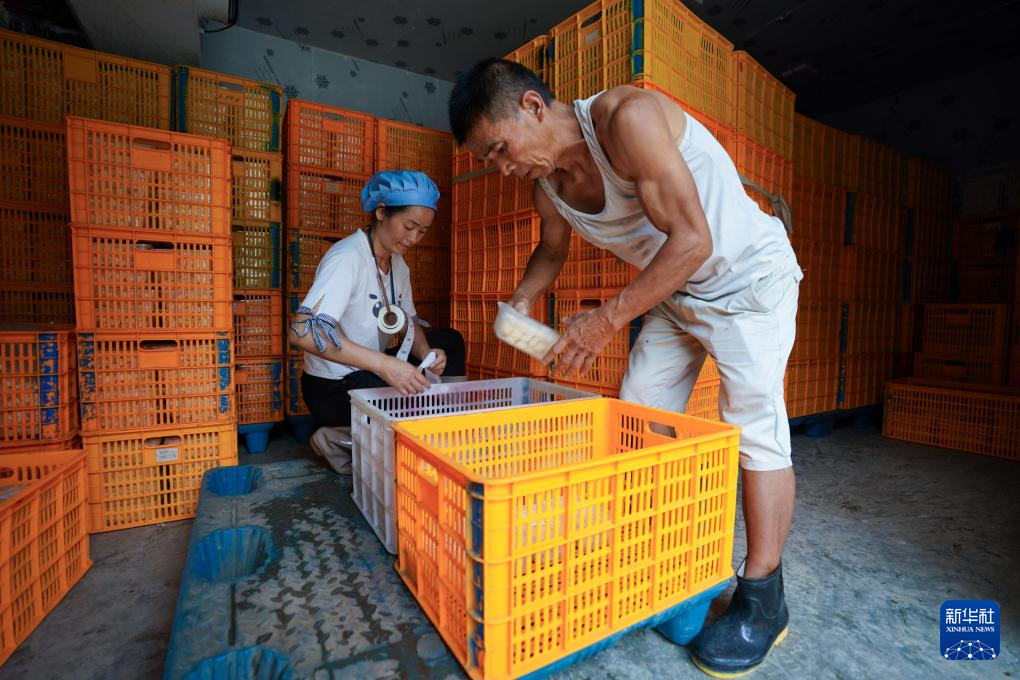 在云南省文山壮族苗族自治州西畴县蚌谷乡龙正村,两名工人在刘禹丹的豆腐加工厂工作(2023年7月27日摄)。新华社记者 陈欣波 摄