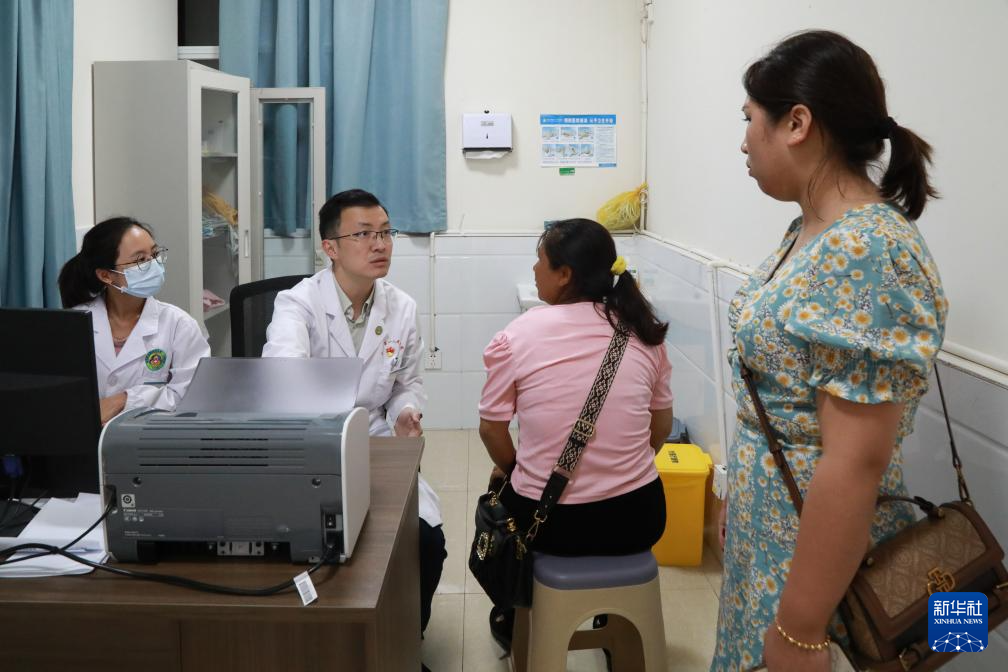 上海第九人民医院援滇医疗队队长刘菲(左二)在云南省普洱市澜沧县第一人民医院诊室内接诊(2024年7月3日摄)。新华社发(潘华杰 摄)