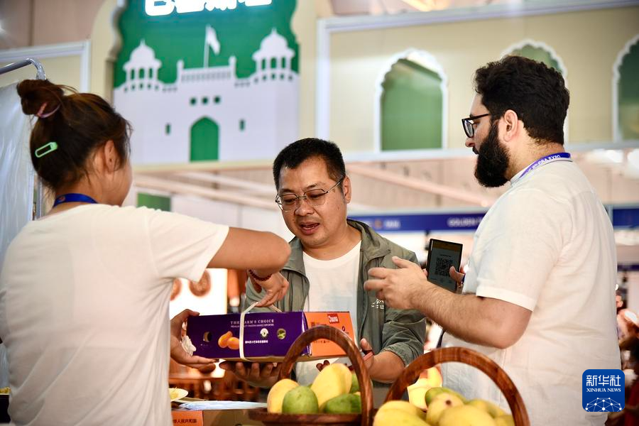 7月24日,巴基斯坦参展商阿德南·哈菲兹(右)向中国顾客介绍巴基斯坦芒果。新华社记者 王贤思 摄
