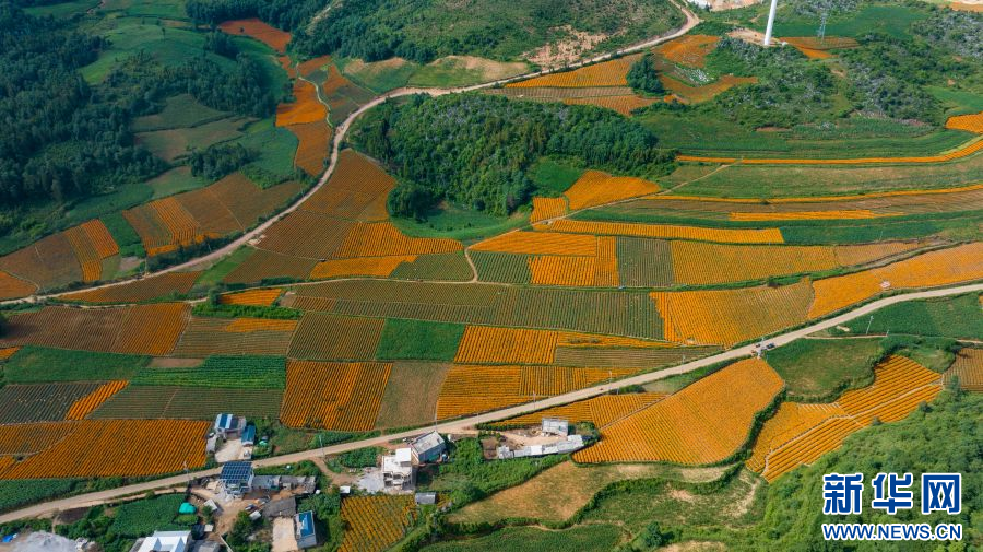 航拍万寿菊(7月24日摄)。新华网发(李星 摄)