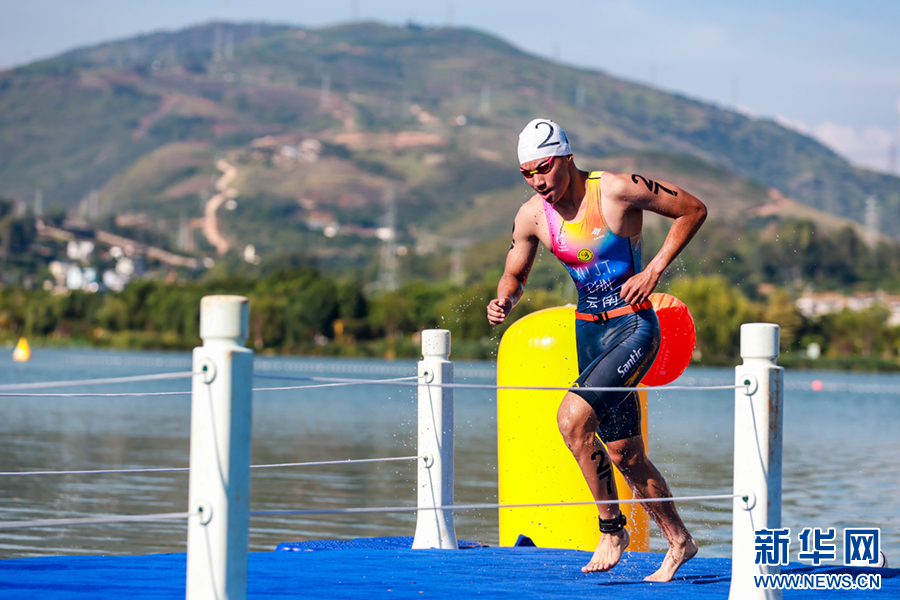 7月24日,云南省第二届青少年(学生)运动会铁人三项比赛中,参赛选手结束游泳起水瞬间。新华网发(陶家淇 摄)