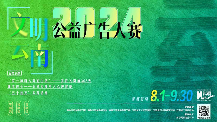 为进一步加强云南省公益广告宣传工作,培育文明风尚,倡导时代新风,推动全社会广泛践行社会主义核心价值观,中共云南省委宣传部等6部门联合主办2024年“文明云南”公益广告大赛,即日起面向全国征集公益广告作品。