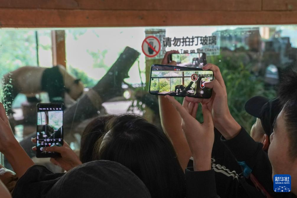 8月2日,现场观众纷纷拍摄正在玩耍的大熊猫“珍多”。新华社发(莫欣竹 摄)
