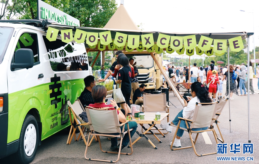 2024滇池东岸国际咖啡文化嘉年华活动现场,市民和游客在一辆咖啡车前品尝咖啡(摄于8月11日)。