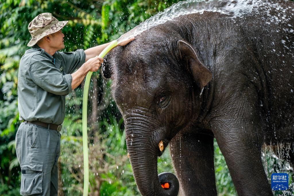 8月8日,“象爸爸”陈继铭给龙龙洗澡冲凉。新华社记者胡超 摄