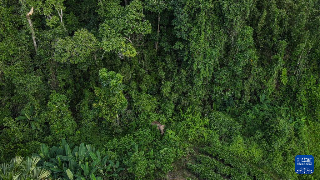 在云南西双版纳国家级自然保护区勐养片区边缘活动的亚洲象阿宝(7月26日无人机照片)。(许团明 摄)
