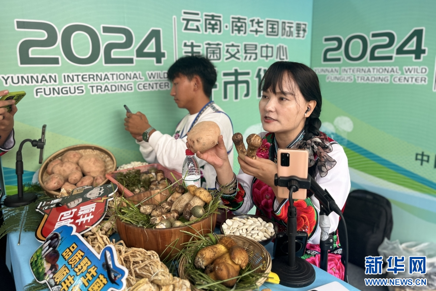 8月8日,云南·南华国际野生菌交易中心开市运营,带货主播正在直播销售野生菌。新华网发(周奕汐 摄)