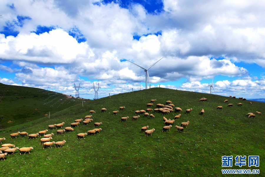 航拍草甸上的羊群(8月17日摄)。新华网发(罗朝俊 摄)