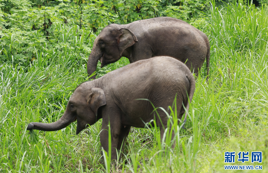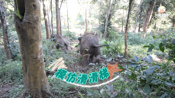 对于暂时无法融入象群的小象来说,“象爸爸”也是它们的模仿对象。小象在跟“象爸爸”去野外做康复训练时,“象爸爸”走在前面,小象跟在后面,就会模仿“象爸爸”走路的动作。