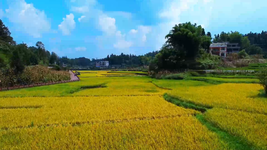 金黄的稻田里白鹭翩飞,与村庄勾勒出一幅山村田园秋色画卷,美不胜收。