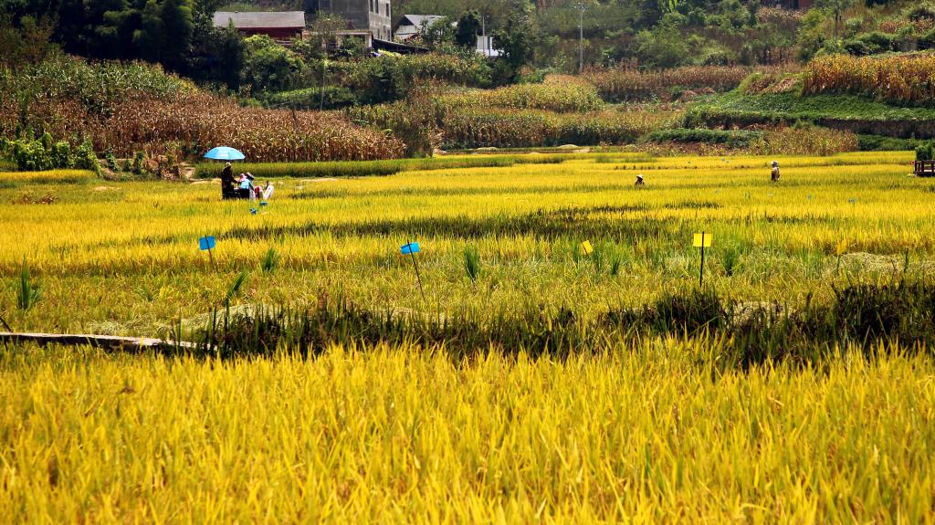 八月的风把稻谷吹得金黄,在云南省昭通市盐津县落雁乡,5000亩生态水稻进入成熟收割期,村民们趁着晴好天气抢收稻谷。