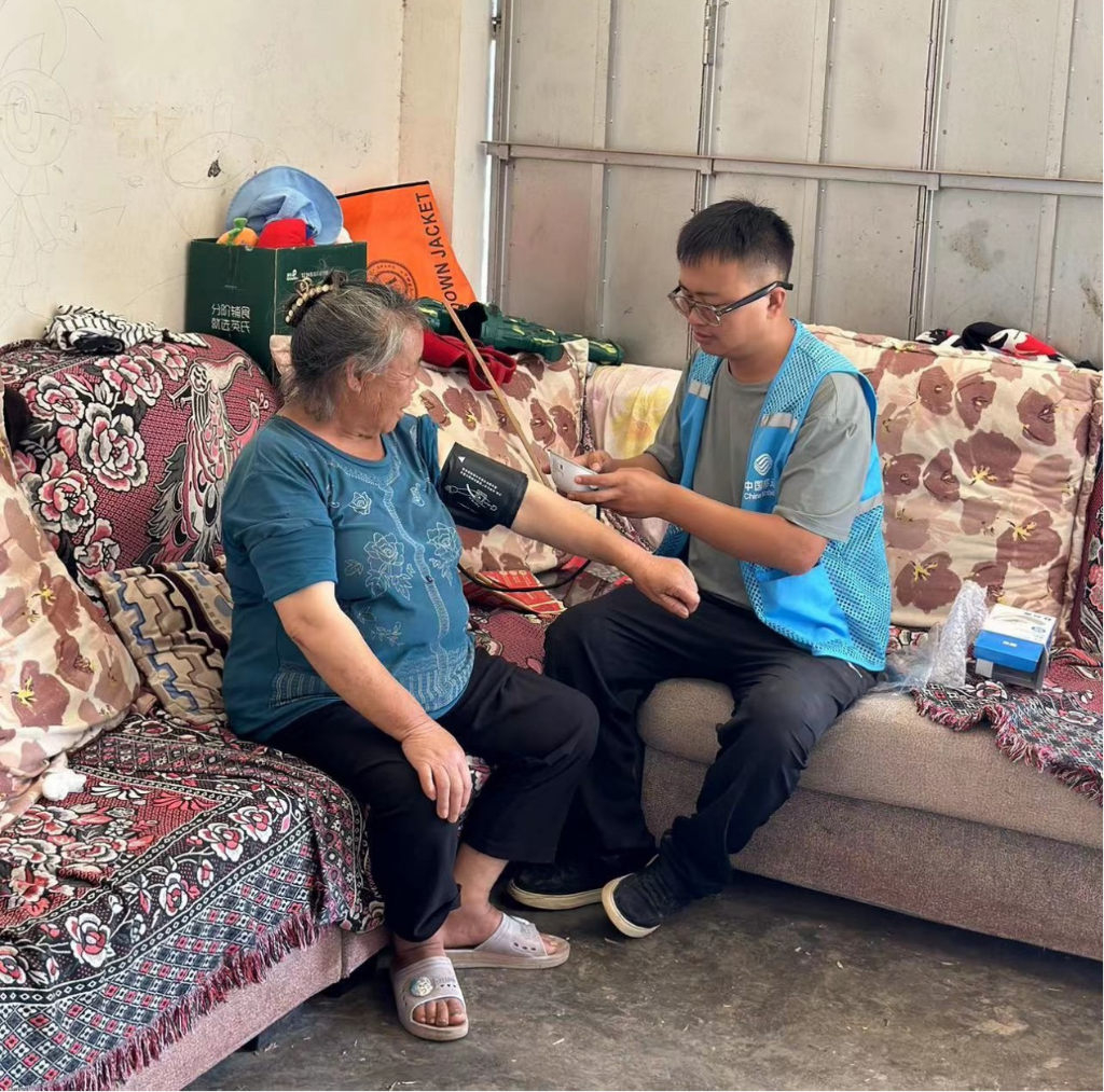 云南移动鲁甸分公司网格主任冯源国用中国移动电子血压计为龙头山客户测量血压(2024年8月24日摄)。