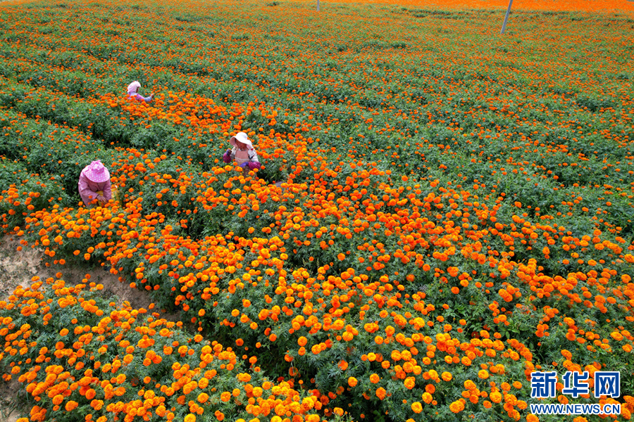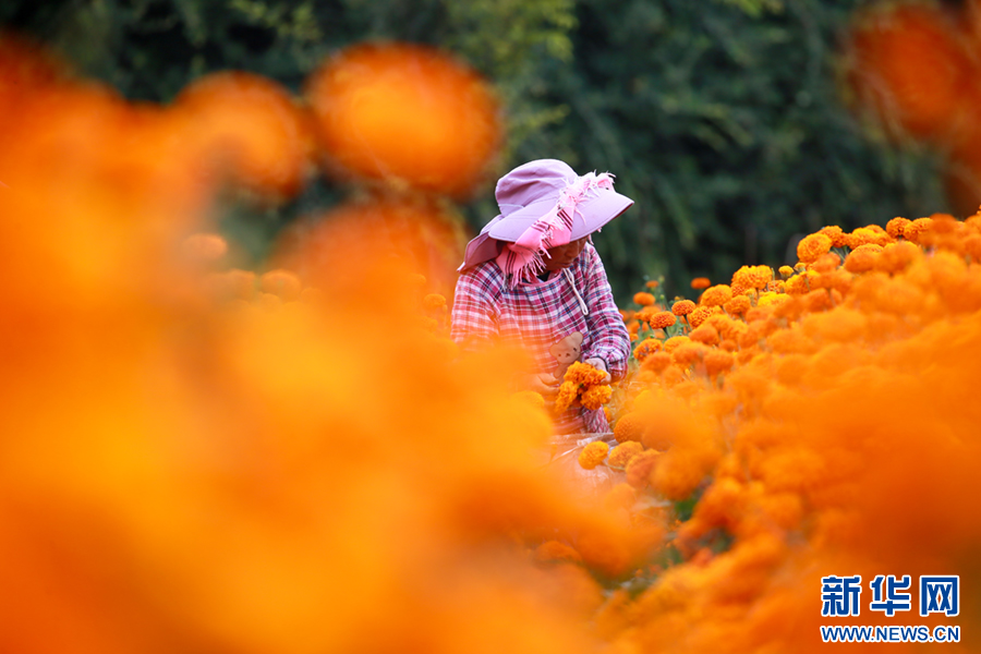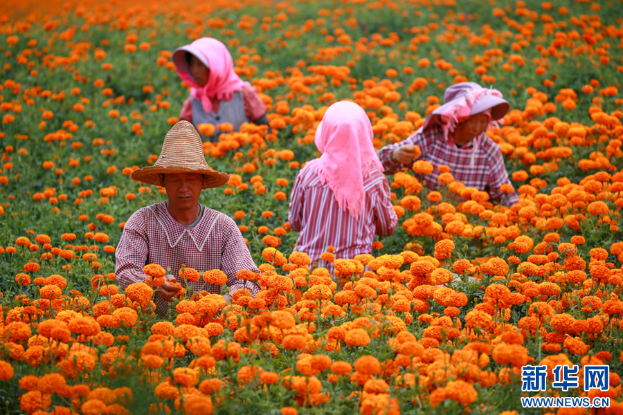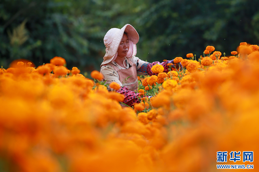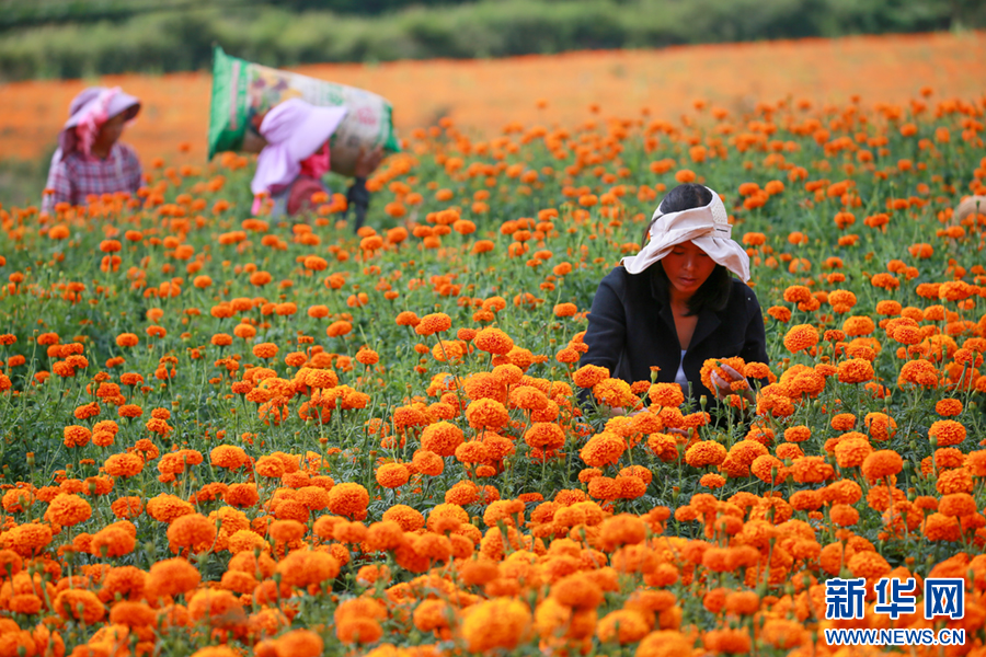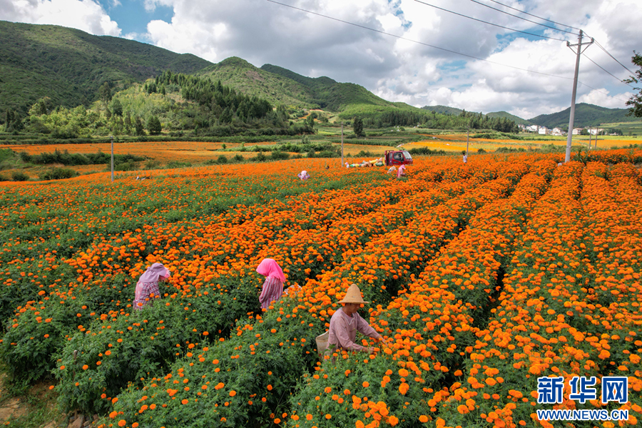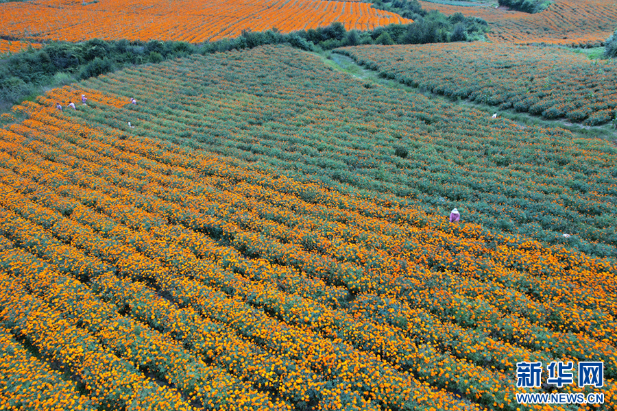初秋时节,云南省曲靖市麒麟区潇湘街道石灰窑村的万寿菊迎来丰收,村民趁着晴好天气采收万寿菊,花田里一派丰收景象。近年来,当地积极优化农业产业结构,引导农民因地制宜发展万寿菊种植,拓展农民增收渠道,助力乡村振兴。新华网发(杨俊鹏 摄)